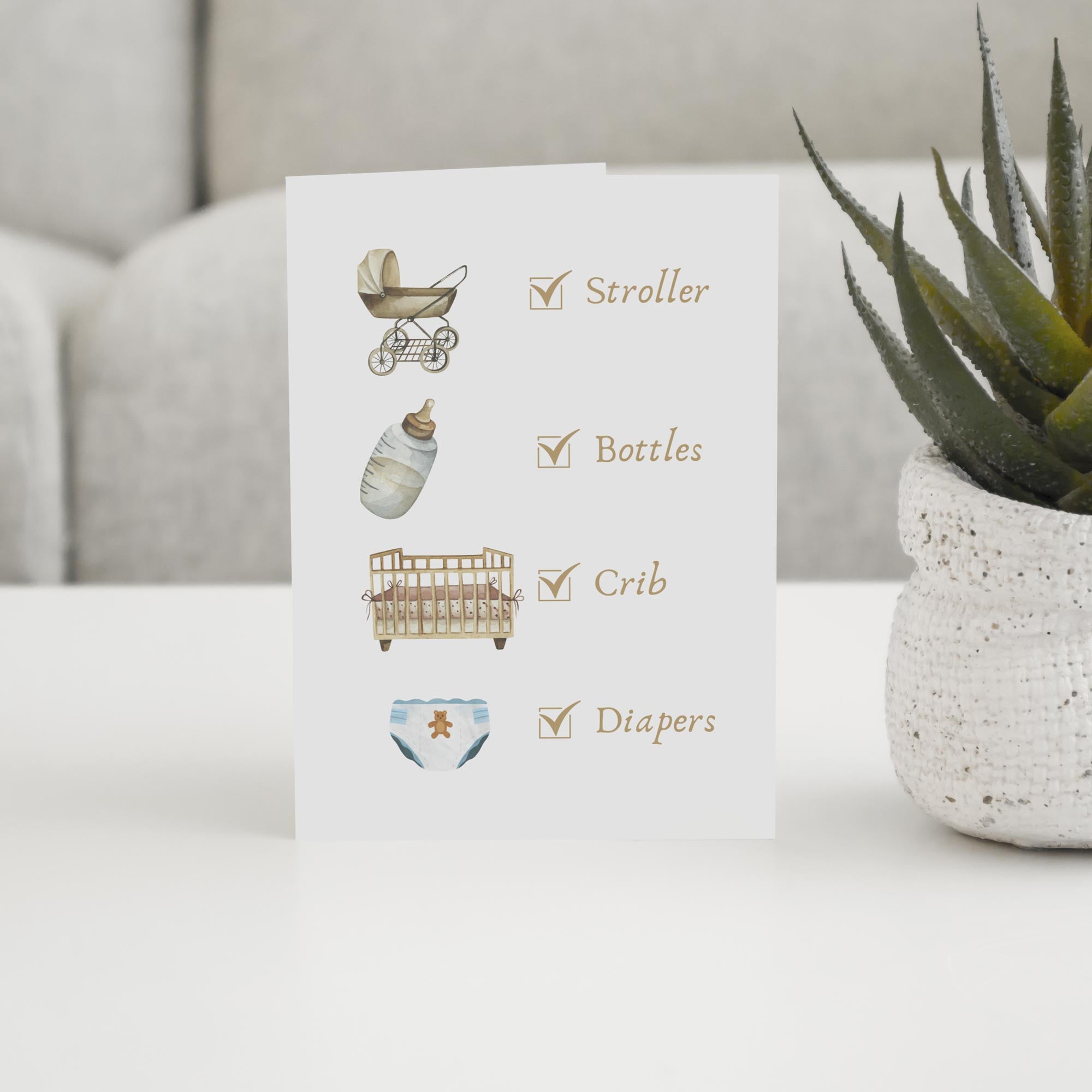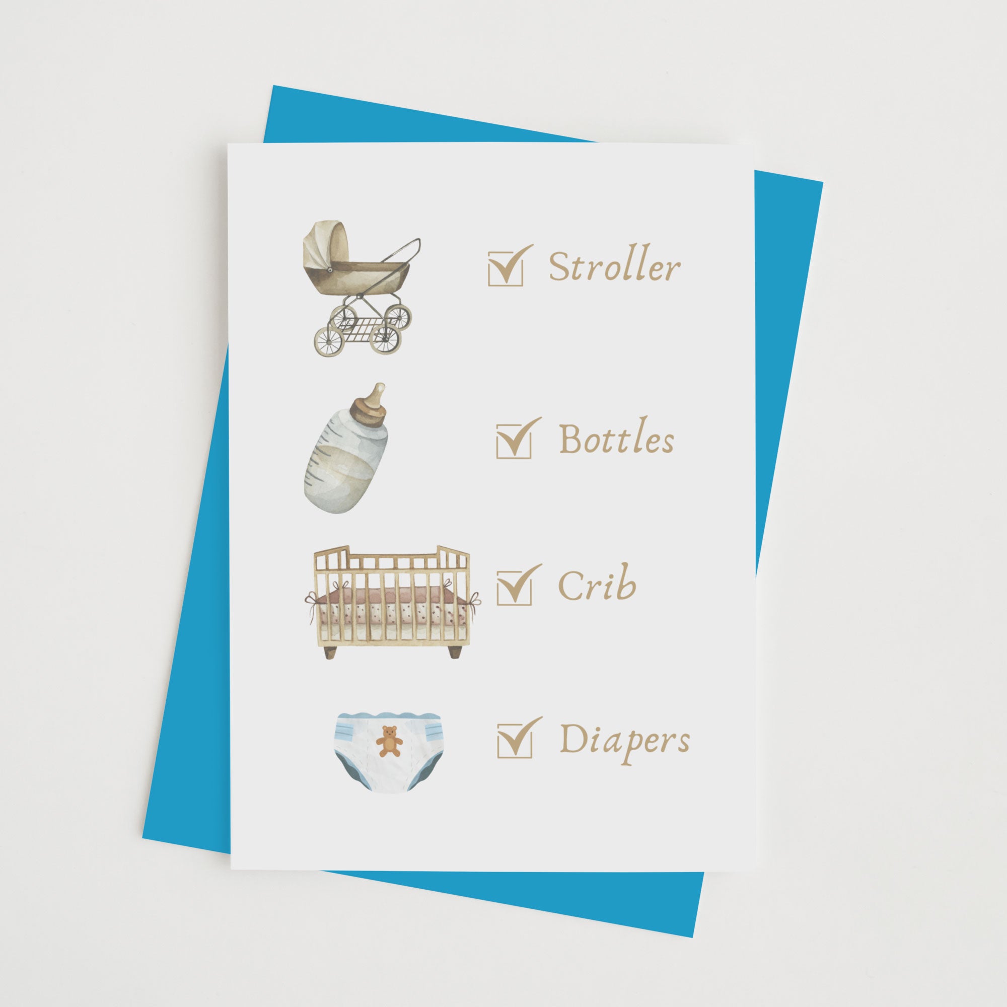 Send the parents to be a checklist of baby essentials with this cute baby shower card.